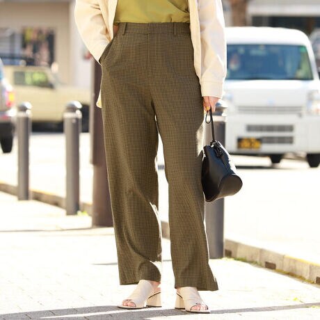 落ち着いた配色のチェック柄が目を惹くパンツ。ベーシックなデザインながら、サイドスリットがこなれ感を演出します。