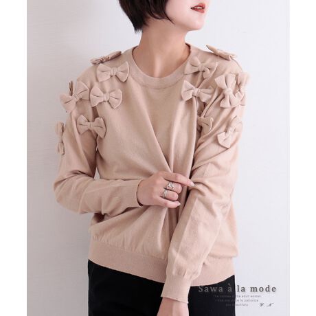 女性の大好きなリボンをここぞとばかりにちりばめた大人可愛いニットトップスです。大人っぽいベージュがリボンの甘さを上手に中和。着る人を選ばないエレガントとキュートさが両立している1着です。