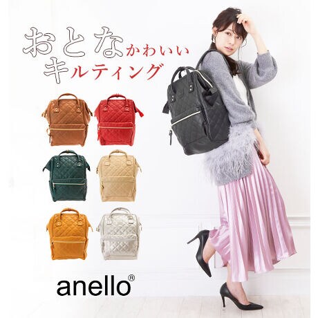 アネロの合皮を使ったキルティングリュックです。アネロ定番のサイドまで大きく開くメインポケットは出し入れがしやすく、中身が見やすいです。キルティングの合皮生地は落ち着いたカラーで、しっかりとした作り。サイズは中型のバッグですが、メインポケットが大きくしっかり物が入ります。後ろのファスナーはメインポケットの中を確認するのに便利で、サイドにはペットボトルなどを入れられるポケット付き