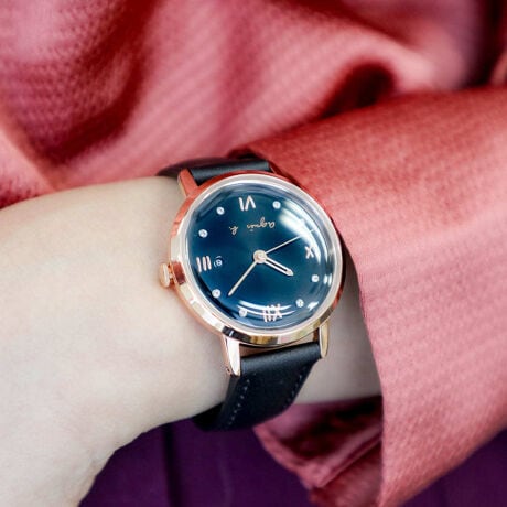 アニエスベー手書きのローマ数字や、軽やかなデザインの時針がスタイリッシュな印象のダイヤルデザインのレディスモデル。ダイヤルインデックスはスワロフスキークリスタル入りで、さりげない華やかさを演出。