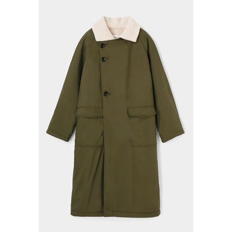 【RAGLAN SLEEVE FLEECE COAT】軽量で暖かく着方のアレンジも楽しめるロングコート。 フロントはオープンでドレープを楽しんでも、ボタンで留めてクールに纏っても、ちょっとしたニュアンスをフロントに演出できる前合わせデザイン。 身頃裏には全面に毛足の長いフリースボア、袖裏には中綿入りのキルティングを使用しています。