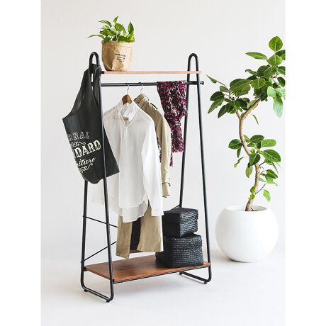 木とスチールが融合したシンプルなデザインの中に、ポイントとなる機能を押えたハンガーラックです。