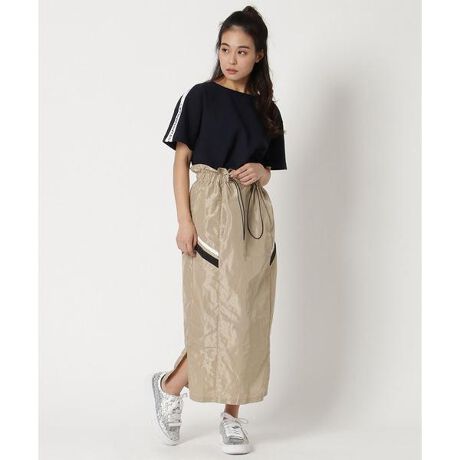 ◇Samantha Vega(サマンサベガ)のスカート配色のラインが効いた、スポーティなシャカシャカ素材のミディ丈スカート。ウエストゴムで着心地が良いのも嬉しい。