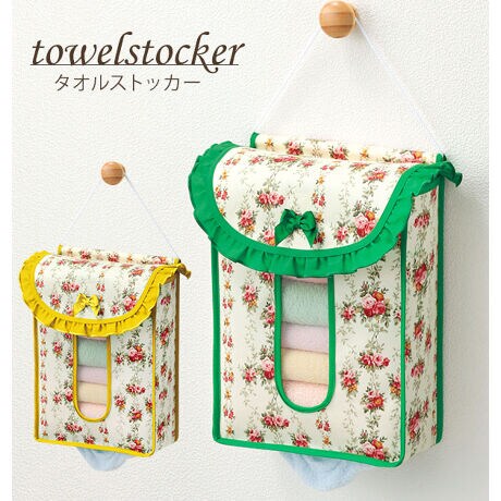 水回りで意外に場所を取っているハンドタオルをすっきりと収納できる!壁掛けタイプのタオルストッカーです。華やかなフラワープリント柄が、キッチンやサニタリースペースを明るく彩ります。フェイスタオルが約10枚〜20枚収納可能。フリルのカラーがグリーンとイエローの2色からお選びいただけます