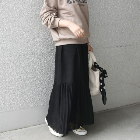 シアーな表情にチェック柄がのぞく一段ティアードのギャザースカート。