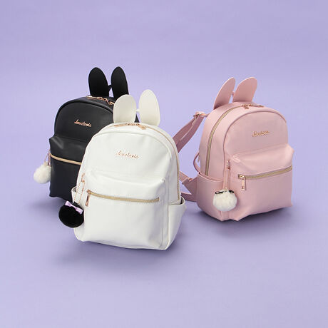 上品な風合いのフェイクレザーを使用したリュックです。ぴょこんと顔を出したうさ耳に胸キュン必至♪ 底マチをしっかり備えているので、荷物が多いGIRLでも安心。しっぽをイメージさせるキュートなポンポンはお好みでつけ外し可能です。