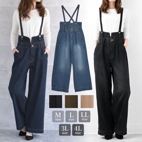 【きれいめサロペット】新色ブラックデニム入荷!ツイル素材 ワイド パンツ ジーンズ ロングセラー