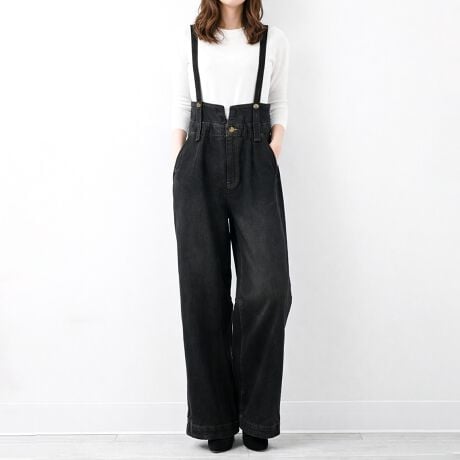【きれいめサロペット】新色ブラックデニム入荷!ツイル素材 ワイド パンツ ジーンズ ロングセラー