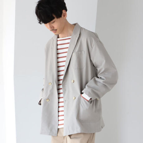 ドロップショルダーを取り入れたワイドシルエットが、旬のスタイルを演出するダブルジャケット。ハリがあるホップサック組織にした生地を採用。裏地がなく軽くてさらりと羽織れる、3パッチポケットデザインのダブルブレステッドデザイン。カットソーにもシャツにもマッチする汎用性の高いジャケットに仕上げました。