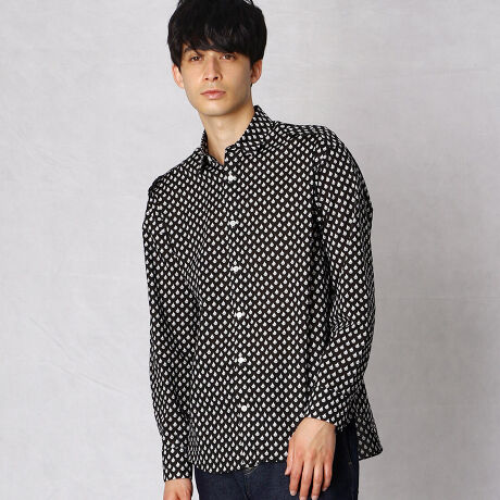 《素材》<br>細番手の糸を使用したコットンブロードに京都の染工所にて繊細なプリントを施しました。美しい光沢と上品なドレープが特長です。<br><br><br>《デザイン》<br>ショートポイントカラーのミニマルなボディに控えめに備えたエポレットが特徴の一枚後身頃は一枚布になっている為、オリジナルのプリントが存分に映える作りです。