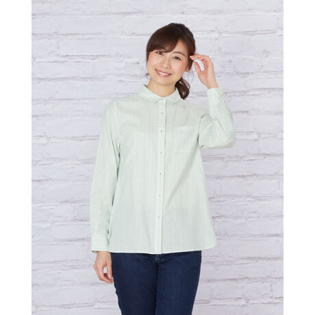 優しい肌触りのWガーゼのストライプシャツです。表と裏のストライプ柄が違って袖を折ると裏の柄が見えアクセントになります。ベーシックなシルエットなのでニットインでも1枚でも幅広く活躍します。左のカフス裏にさりげなく「g」の刺繍もポイント。