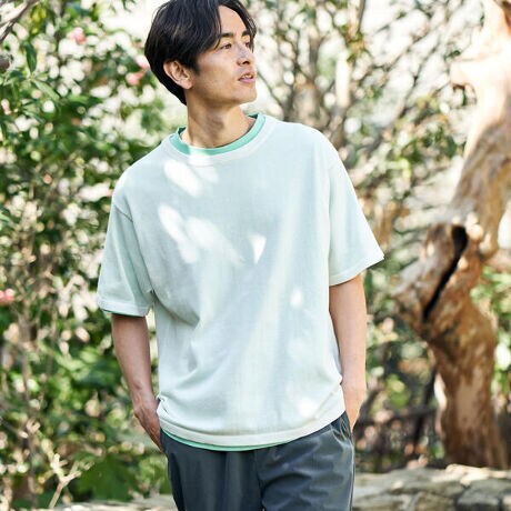 サマーニットと天竺カットソーTシャツがレイヤードになっているコンビアイテム。薄手で軽くイージーケアな合繊混素材のニットに、肌馴染みの良い天然コットンのベーシックTシャツがセット。インナーのTシャツがアクセントカラーに。このアイテムだけでレイヤードのスタイリングをお楽しみいただけます。