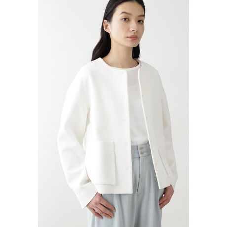 軽さとしなやかさがありながらも、程よいハリ感のあるコットン勝ちのダンボールニットを使用した、ボックス型のノーカラージャケットです。マットなタック釦とサテン地のマチを入れた大きめのパッチポケットがポイントです。季節の端境期の軽い羽織に便利なアイテムです。春らしいオフホワイトと、ベーシックなネイビーの2色展開です。