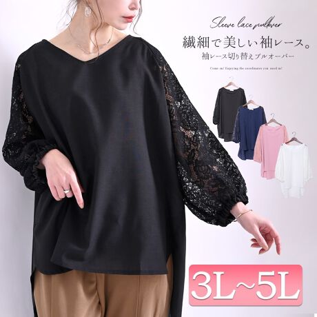 【3L-5L】リネン風袖レース切替えプルオーバー 大きいサイズ レディース トップス シャツ 長袖
