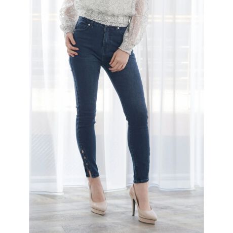 フロントボタンや、裾のクロスデザインがアクセントにきいたスキニーデニムパンツ。