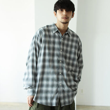 <BEAMS>らしいイージーフィットに仕上げたオンブレチェックシャツ。コットンとポリエステルに加え、レーヨンを生地に使用することで軽やかな着心地で、柔らかな落ち感のある仕上がりに。トレンドを感じるシルエットに絶妙なカラーリングは、トップスでもインナーとしても着られる1枚です。