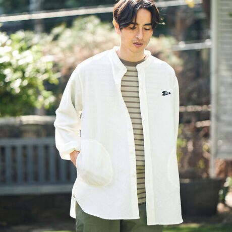 凹凸のあるサッカー素材を使用したバンドカラーシャツが登場。肌に接触する面積を減らして、べたつきを防ぐ生地です。大きめのシルエットに腰ポケットを付けて収納力をアップ。左胸には「NEW YORK」をイメージしたペナント刺繍が入っています。さらっと羽織れてスタイリングの幅が広がるひと品です。