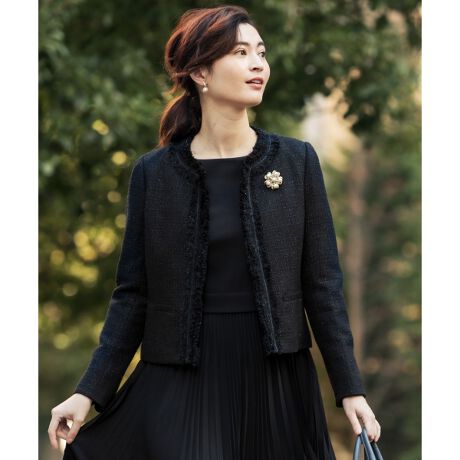 上品なツイード素材がラグジュアリーに映えるノーカラージャケットです。共布のフリンジがアクセントになり華やかな印象に見せてくれます。