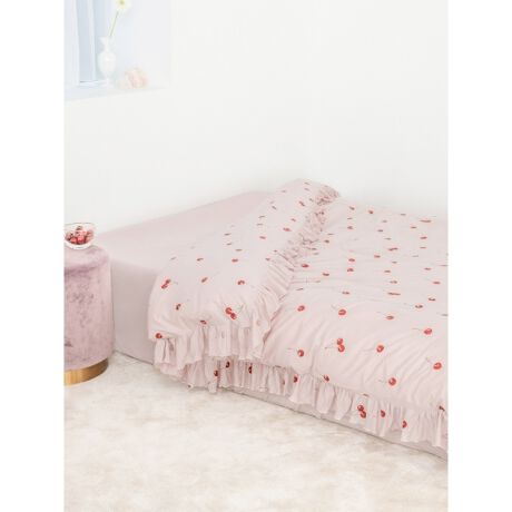 零れ落ちそうな大粒のチェリーを、優しいタッチで描いたシングルサイズ掛け布団カバー。吸湿性に優れたコットンレーヨン素材を使用し、柔らかくしなやかな風合いは肌が喜ぶ寝心地です。たっぷりのボリュームフリルが愛らしく、内側はスナップボタンで布団の着脱が簡単。見ているだけで心ときめくチェリーを、オフホワイトとピンクの大人スウィートなカラーでご用意しました。