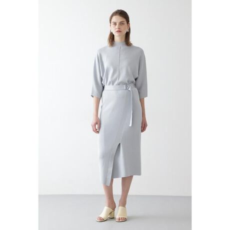 シルク混のしなやかな風合いが特徴の素材をスムース編みに。女性らしいストレートシルエットのスカート。前の切り替えとアシンメトリーなデザインがポイントです。ニット×グログランテープのバックルベルト付き。