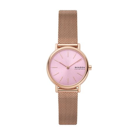 30mm径のケースに二針ムーブメントを搭載したSIGNATUR。ピンクのサンレイダイヤルにローズトーンのスチールメッシュブレスレットを組み合わせました。<br> <br> ウォッチストラップは付け替え可能です。