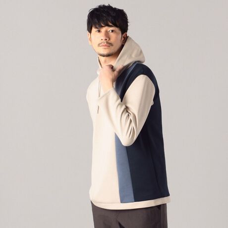 アシンメトリーな切り替えが特徴のプルオーバーパーカー。\n\nハリ感と膨らみのバランスが特徴のダンボールニットです。〈Cold Pad Batch)という手法で染色されており、従来の染色より使う水の量が少なく環境にやさしいのも特徴です。大胆な切り替えがポイントです。