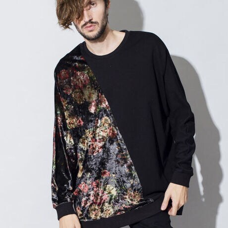 アシンメトリーな切替やベロアで表現したペイズリーとフラワーがベーシックなプルオーバーにはない特別感を与えてくれる。