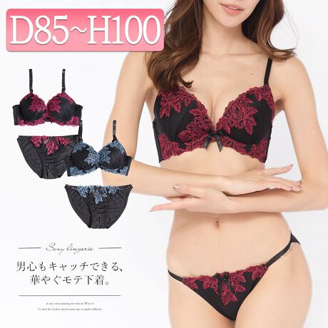 【D85-H100】ゴージャス花刺繍ブラ&ショーツセット 大きいサイズ レディース インナー 下着