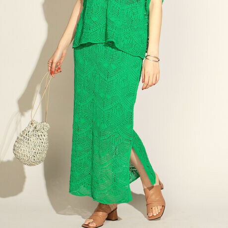 ざっくりとした7Gの編み感がお洒落。透かし柄がレトロなムードのロングスカート。華やかさのあるデザインで、着こなしにアクセントを与えてくれる一枚です。下着が透けるのを防止するインナースカート付きでコーディネートの心配がないのもポイント。同素材のプルオーバー(1−0030−2−02−006)とセットアップ着用も可能です。