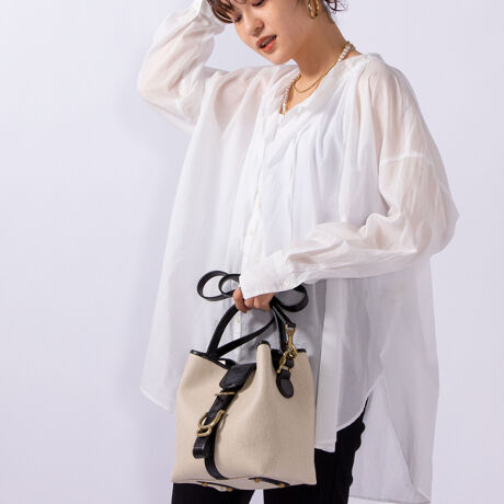 キャンバスとレザーを組み合わせたミニトートバッグ。バックル付きのフロントベルトは、ワンタッチで開閉できるマグネット仕様にしています。マチの広いボックス型をベースとしており、上部両側のストラップを留めると柔らかなフォルムにチェンジ。ショルダーストラップはお好みでつけ外し可能です。