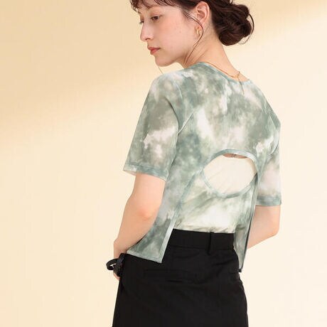 チュールにオリジナル柄のマーブルプリントを施した、Tシャツとキャミソールのアンサンブル。重ねて着用した時に、背中が開いて見えるバックスタイルがデザインポイントです。