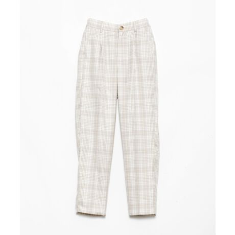 別アイテムとのセットアップ風でも着れる上品パンツセンター部分にプレスの入ったハンサムレディ感のあるパンツは、ウエスト部分をゴムで仕上げ、リラクシー感のある1枚に◎ゴム仕様ながらも、トップスをインしてのスタイリングもスッキリと見せてくれます◎同柄同色のジャケット(PH0387)とのセットアップ風の合わせもオススメです◎ 伸縮性:なし; ウエスト(あり) 透け感:なし