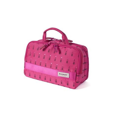 ラズベリーピンクにかわいいリップ柄をあしらった、大きめのポーチ。