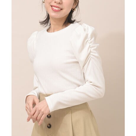 シンプルに華やぐパワショルカットソー。スタイリングが華やかでトレンドライクに仕上がるパワーショルダーカットソー。シンプルなカットソーも袖にボリュームをつけるだけでゴージャスな印象を与えます。身頃はコンパクトに仕上げてすっきりと。伸縮性のあるテレコ素材なのでリラクシーにご着用いただけます。顔周りは肌の露出が少ない丸首で上品に。パンツやスカートはもちろん、ジャンスカやサロペットのインナーにもピッタリなアイテムです♪ 裏地なし 伸縮性あり 薄手 織キズやだま等みられる場合もございます 洗濯:手洗い可