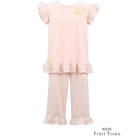 キッズのプレステージグループFirstTiara<ファーストティアラ>トップ:普通丈・半袖。ボトム:七分丈ズボン。・本体素材は綿100%を使用しています。・細い番手の超長綿(ブレンド)を使用。バイオ加工により表面の毛羽を極限まで削ぎ落とし艶やかな表面感に。・シルケット加工をほどこすことでシルクのような光沢と、なめらかな肌ざわりの上質なスムース素材です。・肩と裾のエンブロイダリーレースが軽やかでフェミニンなデザイン。・お花のレースモチーフがかわいいパジャマです。【サイズ詳細】4:バスト65cm、着丈43.1cm、ズボン脇丈44.7cm、ウエスト46cm6:バスト70cm、着丈47.3cm、ズボン脇丈54.6cm、ウエスト48cm8:バスト82cm、着丈53.9cm、ズボン脇丈59.6cm、ウエスト52cm10:バスト91.2cm、着丈60.2cm、ズボン脇丈71.7cm、ウエスト55cm12:バスト94.8cm、着丈65cm、ズボン脇丈76.7cm、ウエスト59cm※出来上がり寸法を表示しております。※サイズ詳細の寸法には多少の差異がございます。