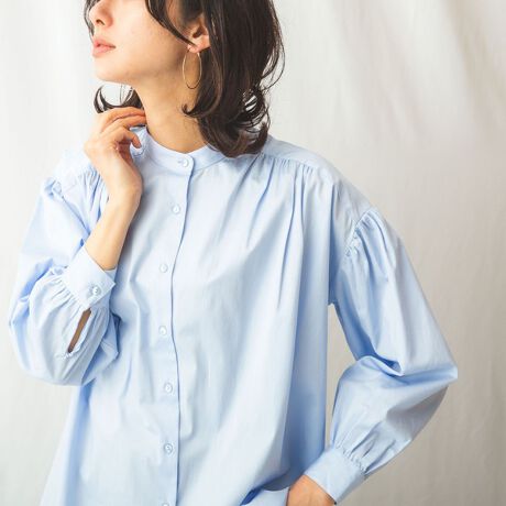 首元はバンドカラーですっきりとまとめ、袖はふっくらとボリュームを持たせたチュニックシャツです。シルエットは、今年らしいドロップショルダーのオーバーサイズ。ギャザーをふんだんに施すことで、フェミニンな雰囲気を演出しています。着こなし全体に軽さをもたらす、サイドスリットを入れた前後差のある裾もバランスのいい仕上がりです。