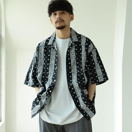 存在感のあるバンダナ柄を使用したオープンカラーシャツ。サイドに配した大き目のポケットもワンポイントに。ゆとりのあるシルエットでトレンド感のあるアイテムに仕上がっています。同素材のシャツブルゾン・ショーツの展開あり。セットアップ・アンサンブルで着用可能です。
