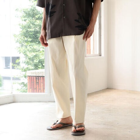腰回りは余裕がありつつ、裾にかけてすっきりとテーパードさせた美しいシルエットが特徴です。深めに入った2プリーツがシルエットの立体感を際立たせます。腰部分はゴムシャーリング仕様でフロントにはドローコードを配しベルトレスでも着用可能。