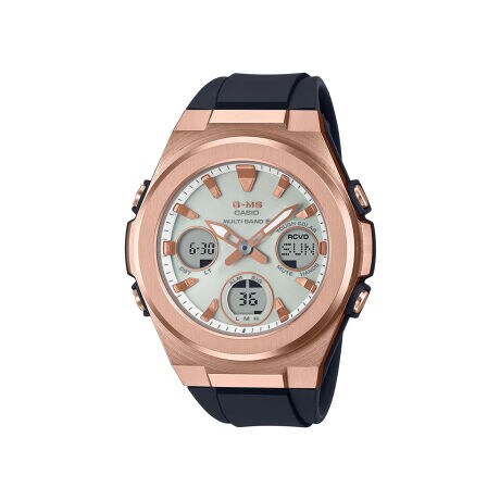 ブラックベルトに映えるピンクゴールドのケースは、クールで女性らしい印象です。