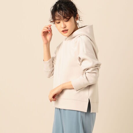 適度なハリとクリーンな風合いを備えたダンボール生地のプルオーバーフーディ。シンプルなデザインも相まって、カジュアルながら大人らしい印象の1枚です。ワイドめなシルエットはコーディネートに今季らしいリラックス感をプラス。旬のワイドパンツやロングスカートともバランスがよく、デイリーに幅広く活躍します。
