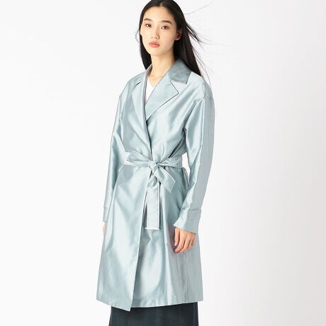 《デザイン》大きめの衿とこだわりの分量感でキレイ目でありながらリラックスした雰囲気のライトトレンチコートです。驚きの軽さとエアリーな着心地がポイント!ドットやバックルに使ったシルバーメッキがシックな印象をプラスしています。ゆったりとしたシルエットでジャケットの上に軽やかに羽織れるのも嬉しいところ。《素材》タテ糸にモノフィラメントという極細の糸を使用したタフタ素材です。薄手でハリがあり、他にはない軽さと繊細なピケ組織が特徴です。光沢感と立体的な陰影が奥行きのある表情を生み出しています。