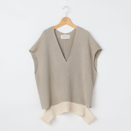 麻のようなハリのあるクリスピーコットンを使用したニットトップ。たっぷりとしたボクシーなシルエットは、深いVネックてセンターシームですっきりシャープな印象に。配色の裾部分は横にスリットを入れ、変化をつけています。さらっとした肌触りで着心地も快適です。