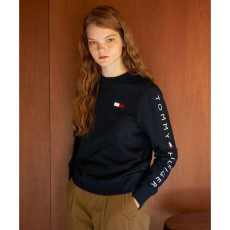 ・<デザイン・シルエット>・胸元と袖にブランドロゴを配したクルーネック長袖スウェット。・袖口と裾のリブ切替え、衿ぐりのガゼットステッチが王道カジュアルへと引き上げ。<ファブリック>・コットンベースの生地は、インナーとしてもレイヤードしやすい快適な着心地。・肌触りの良いソフトなフレンチテリー素材の裏パイル地を使用。・Tシャツとスウエットの中間くらいのしっかりとした生地感でロングシーズン着回せます。透け感:なし 厚さ:普通 伸縮性:あり <スタイリング>・1枚でインパクトのあるトレーナーは、ジーンズやスニーカーと合わせシンプルにまとめるのがオススメです。・イベントなどでカップルやグループとのお揃いコーデも楽しめる豊富なサイズ展開。・あえて大きめのサイズを選び、オーバーサイズなストリート風の着こなしも楽しめます。