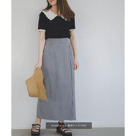レトロな雰囲気漂うギンガムチェックのタイトスカート。ラップ風なデザインに、膝ぐらいまでの深スリット入りなので足さばきも良好です。やや裾に向かって広がるタイトすぎないシルエットです。ウエストは後ろゴムなので穿き心地も楽ちんです。※両脇にポケット付き・膝上丈の裏地付き