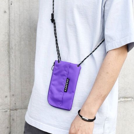 携帯電話やカードをコンパクトに収納し、首下げや肩下げが出来る様に調整可能なストラップ付き。