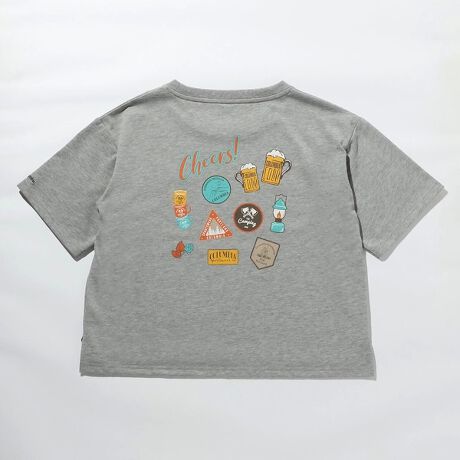 ゆったりしたボックスシルエットとショート丈、ドロップショルダーで抜け感のある着こなしを楽しめる半袖Tシャツ。吸湿速乾性のあるやわらかなコットン混素材なので、いつもさらっとした着心地です。背面にはビアジョッキやマグカップ、ランタン、ワッペンなど、キャンプ気分を高めてくれるイラストをプリント。夏のアウトドアをトレンド感あるスタイルで満喫できます。