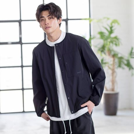 程よいベーシックシルエットのシャツ感覚で羽織れる薄手のノーカラーブルゾンです。(シャウター)