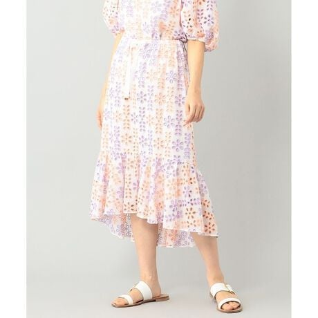 インポートならではの生地を活かしたフェミニンスカート。トルコ“BROCHE”(ブロチェ)社のバイカラーカットワークレースを贅沢に使用。縦長のすっきりとした後ろ下がりのデザインに、フレア切り替えを入れた、どの角度から見ても品のある、程よい甘いシルエットが魅力です。シンプルなカットソー合わせはもちろん、お揃いトップスとのセットアップスタイルもお勧めです。