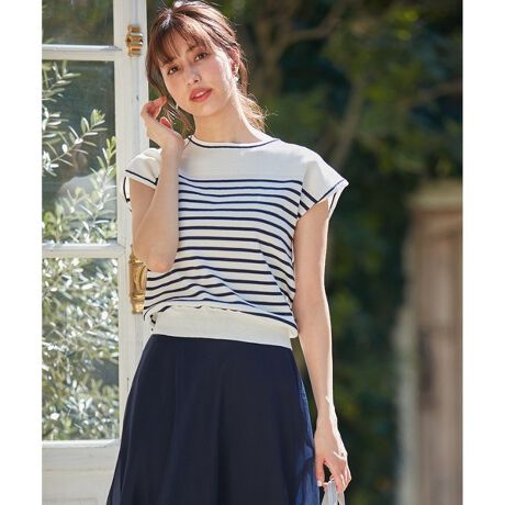 ■デザイン腕周りがすっきりと見えるようにこだわったフレンチスリーブデザインです。ベーシックなボーダートップスは、胸元で編地を切り替えて新鮮な印象に。コンパクトに着こなせる丈感なので着合わせるボトムスを選ばず、幅広く着回しを楽しめます。