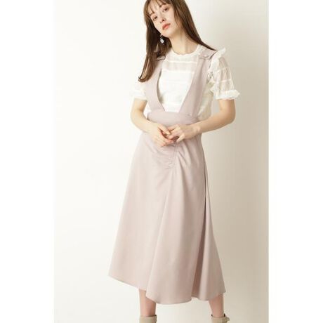 揺れ感あるイレギュラーヘムが印象的なジャンパースカート太目のショルダーはバックスタイルでV字を描き、レイヤードスタイルが大人っぽい印象に。ショルダー部分はウエスト内側のボタンで取り外し可能、シンプルなイレヘムスカートに表情が変わる2Wayデザインです。スカートはギャザーを寄せたデザインもポイントです。甘めのブラウスやシンプルなリブトップスなど、雰囲気をかえたスタイリングを楽しめます。※左ファスナー付き・裏地付き